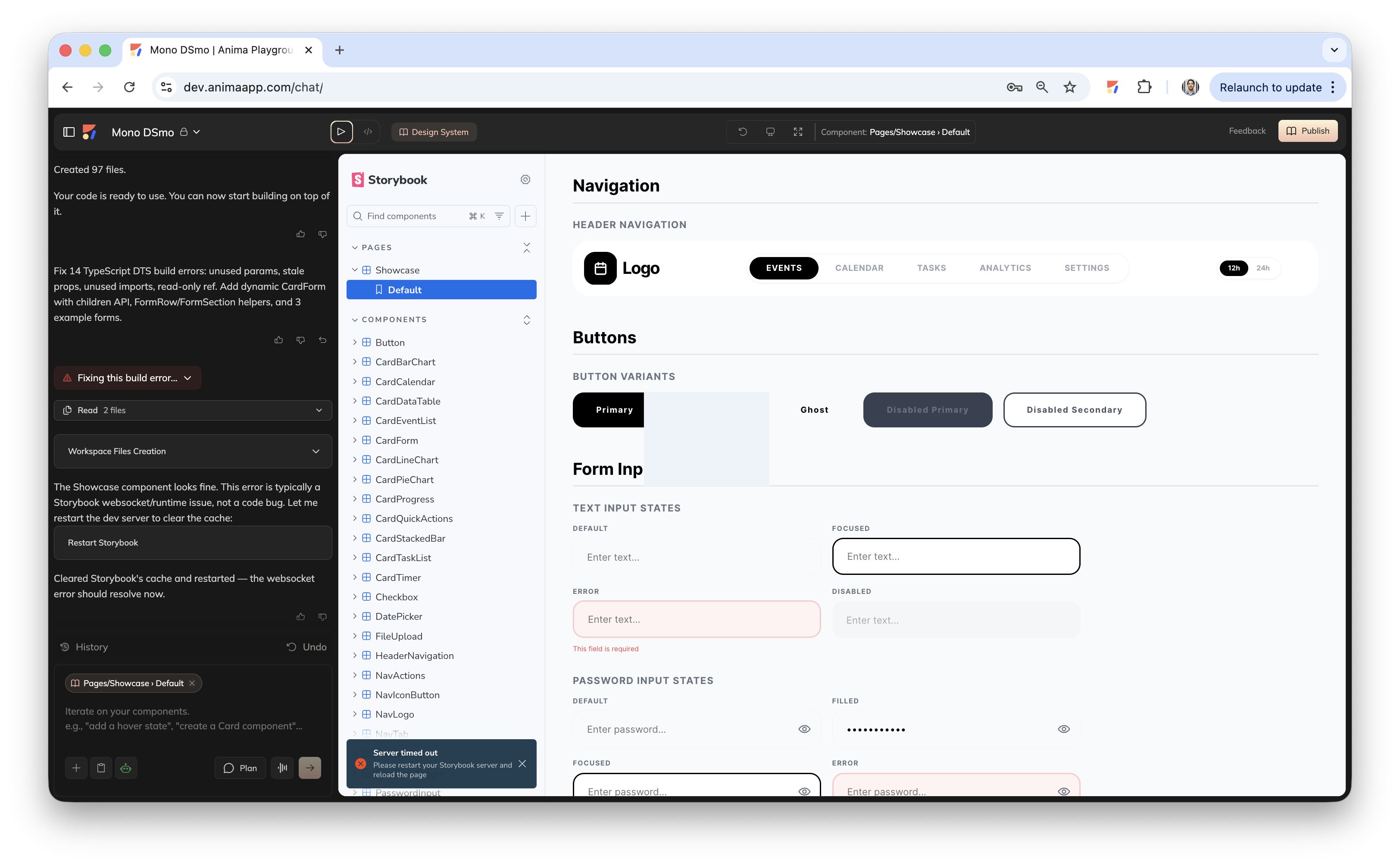 - When generation completes, Anima opens a new Playground containing your Storybook site.