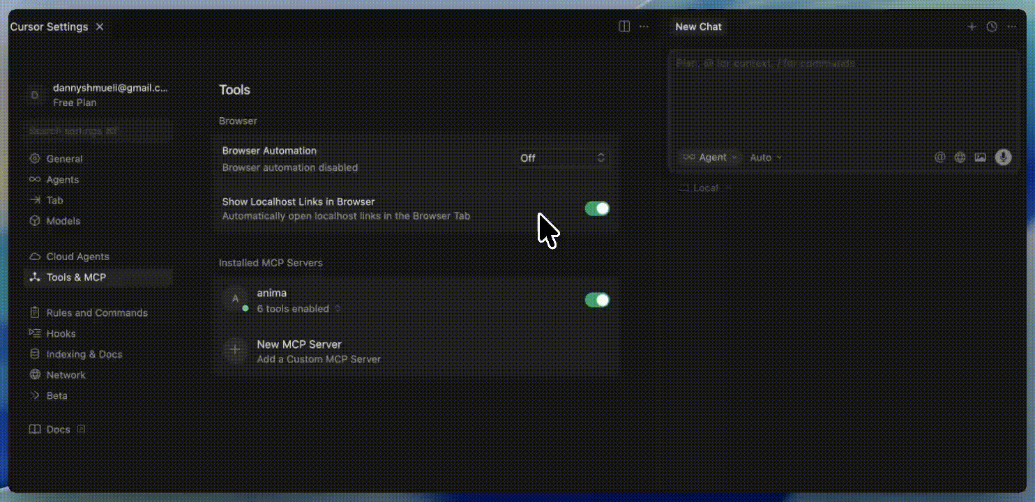 /mcpto open the MCP menu - Select Anima and authenticate. This opens a browser window to sign in with your Anima account.