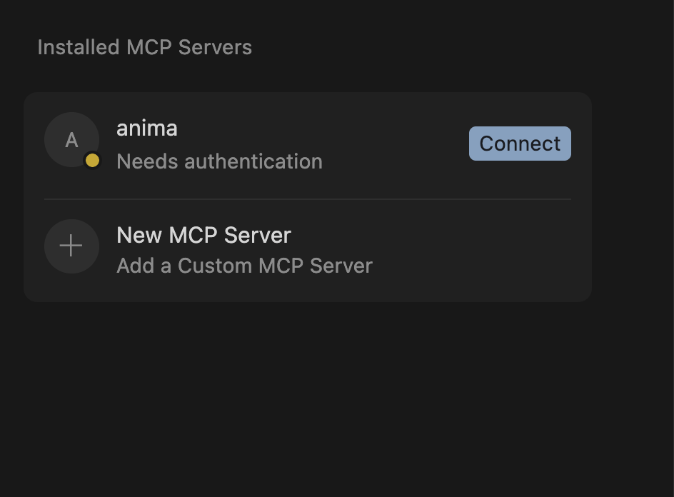 After saving, you'll see "anima" appear under Installed MCP Servers with "Needs authentication"