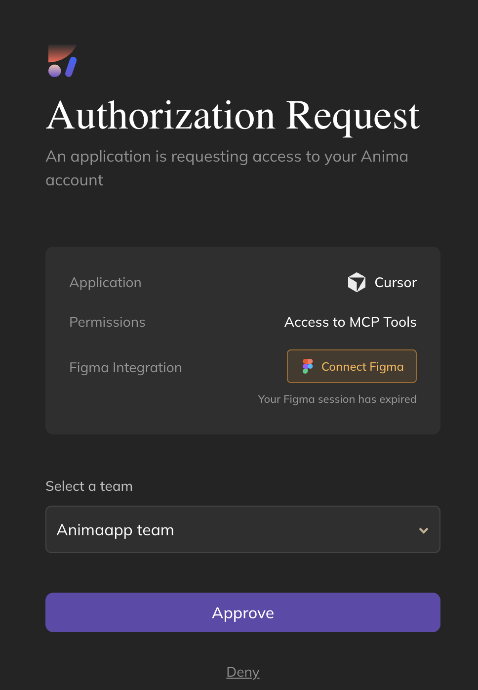 Click Connect to authenticate. This opens a browser window to sign in with your Anima account.