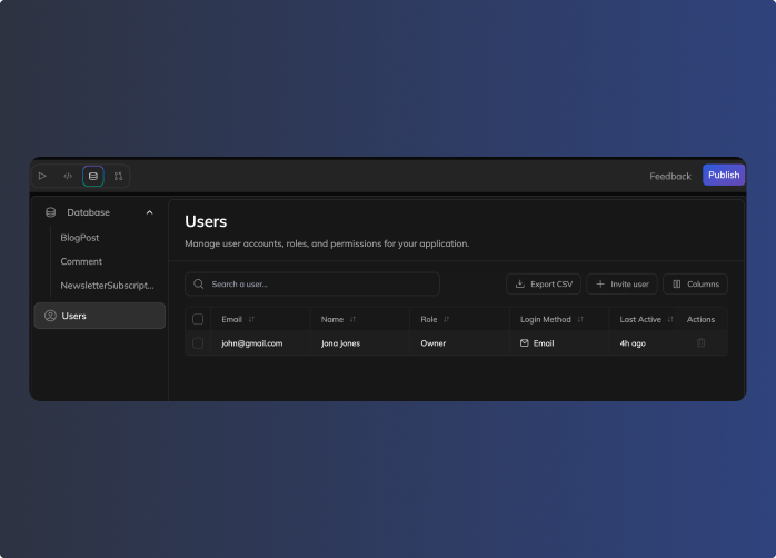 Use the search bar to find users by email or name. Helpful when your app has many users.