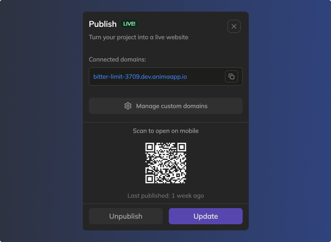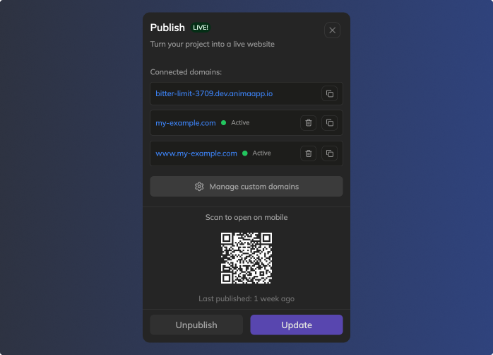 - With connected domains: Your project goes live on both your custom domain(s) and the default Anima URL