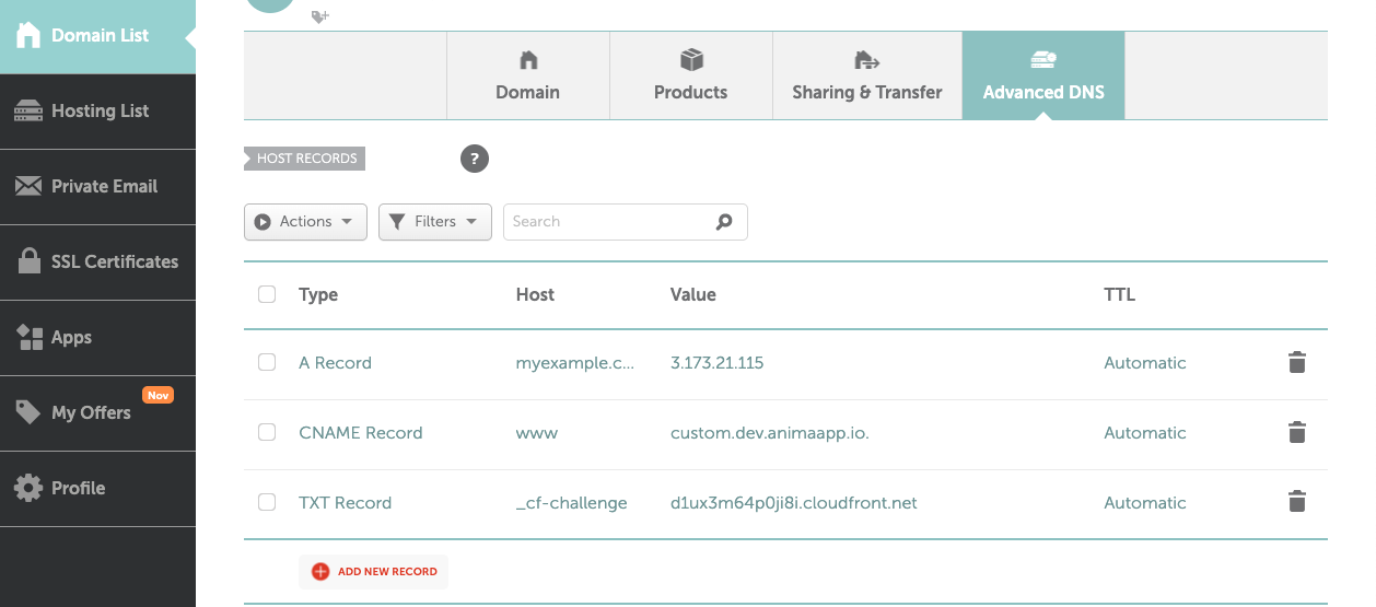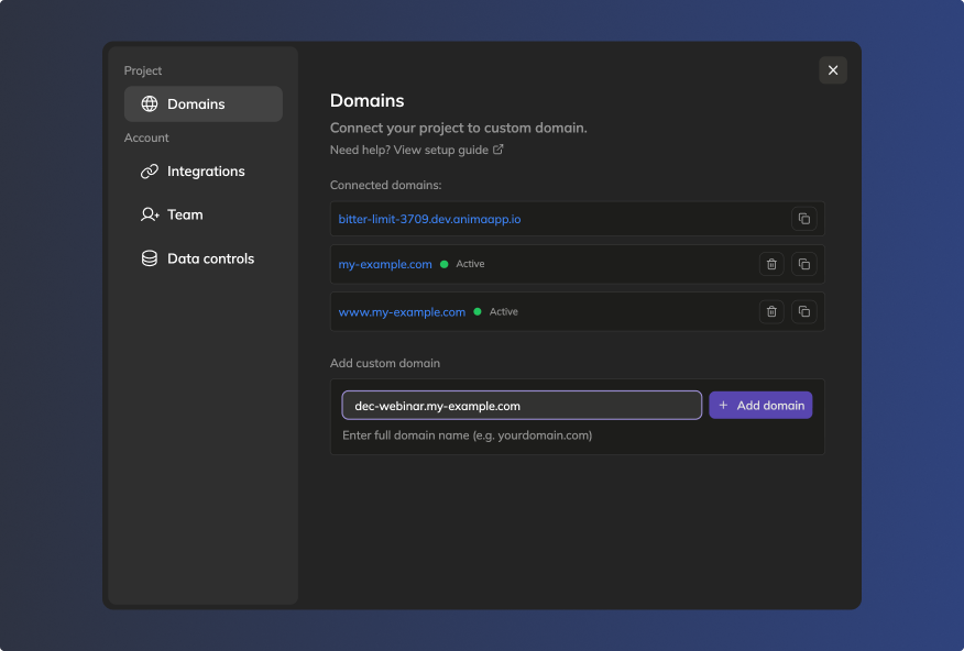 Own your domain first: Anima is not a domain provider. Get your domain from a registrar like GoDaddy, Google Domains, or Namecheap before connecting it here.