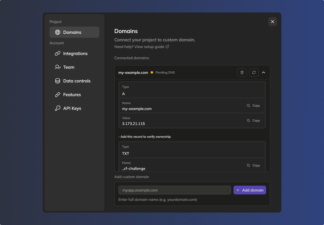 Copy the DNS records shown and add them to your domain provider's settings.