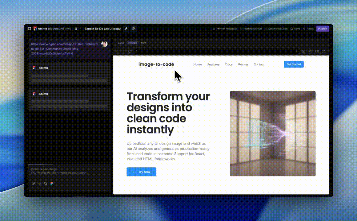 Plan access: Custom domains are available for the Starter plan and above. Free users can publish to an Anima-provided URL.