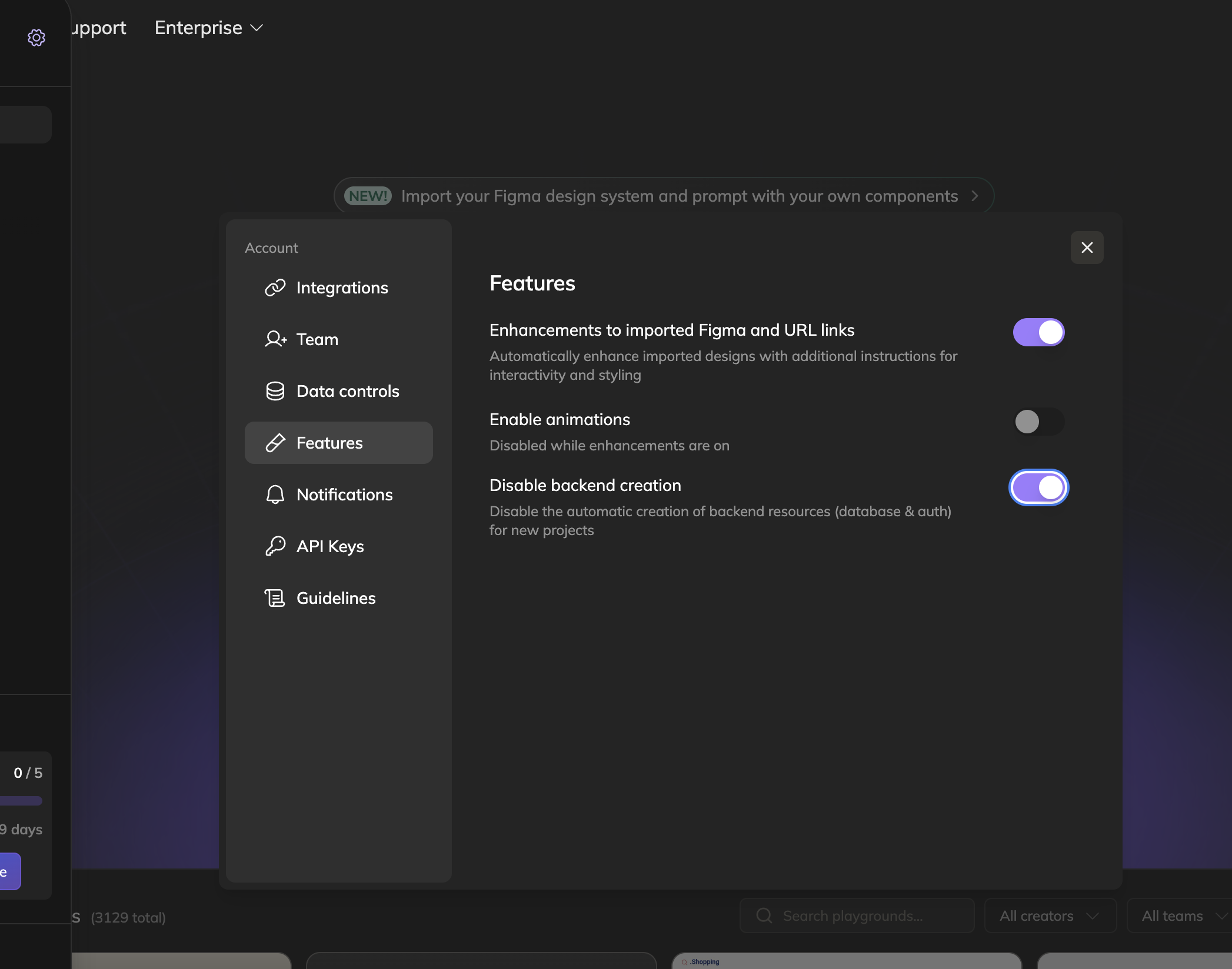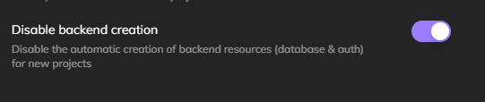 | Disable auto-database | Settings → Features → Toggle on "Disable backend creation" | ![]() |