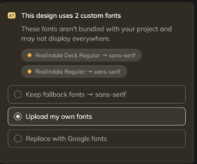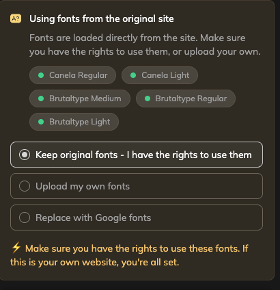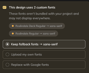 When you clone a website, Anima scans the page and detects every font used in the original design. Results appear as an inline alert in the chat, with each font shown alongside a status indicator.
