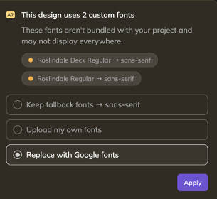 - Replace with a Google Font. Anima swaps the fonts to the closest-matching Google Font.