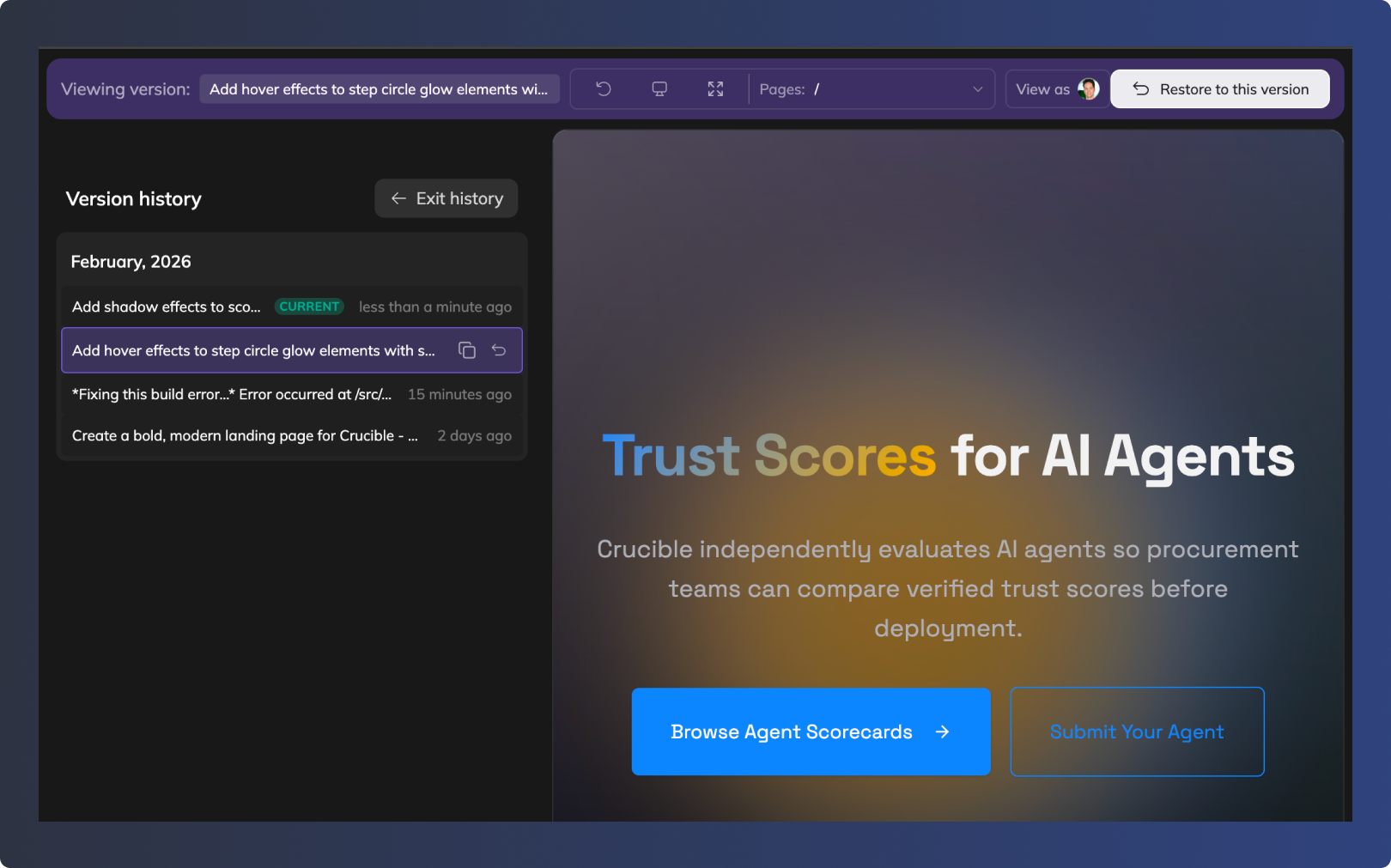 Every AI change is saved automatically. Browse, preview, and restore any previous version of your project.